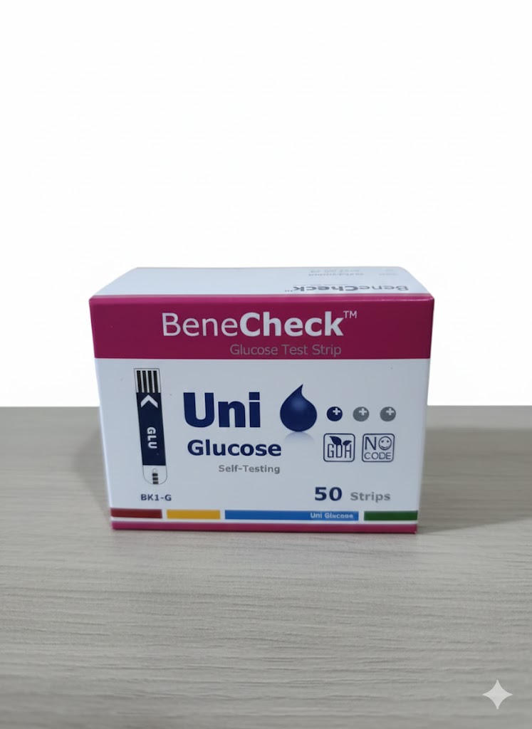 Bene-Check Uni Glucose Strips are test strips made for the Bene-Check Uni blood-glucose meter. They enable quick, accurate blood-sugar measurements from a small finger-prick blood sample. Compact and easy to use, these strips provide reliable glucose readings within seconds ideal for daily diabetes monitoring at home or on the go.