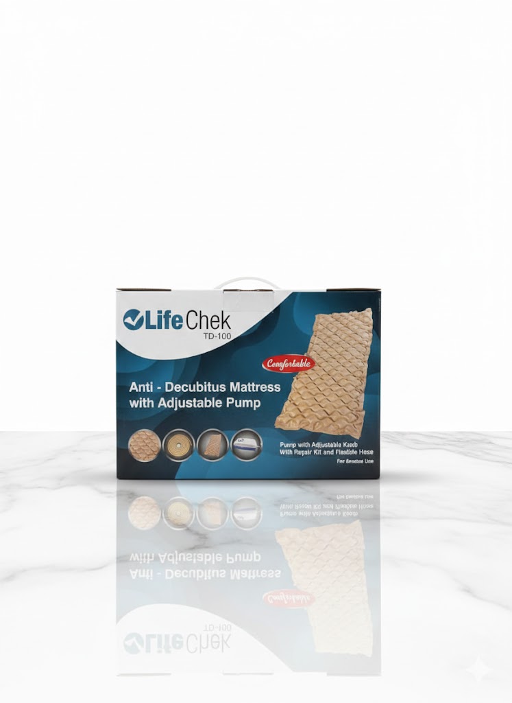 The Life-Chek Anti-Decubitus Mattress with Adjustable Pump is designed to help prevent and manage bed sores (pressure ulcers) in patients with limited mobility. It features an alternating pressure system with an adjustable air pump that improves blood circulation, reduces constant pressure points, and provides comfortable, supportive care for long-term use at home or in medical settings.